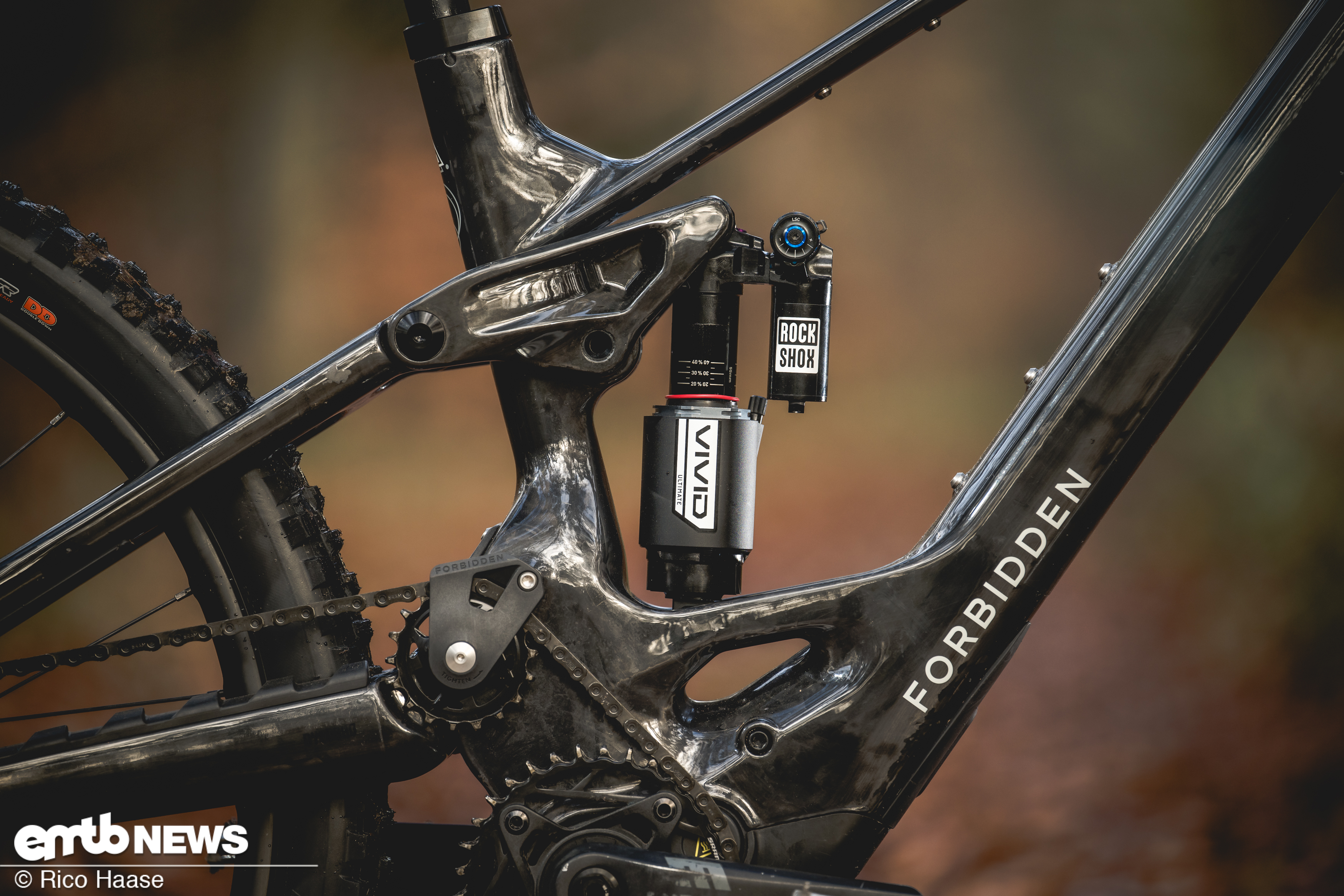Sowie einen Vivid-Dämpfer, der aus 55 mm Hub 150 mm Federweg generiert. im Album Vergleichstest DJI-E-Bikes – Forbidden Druid Core