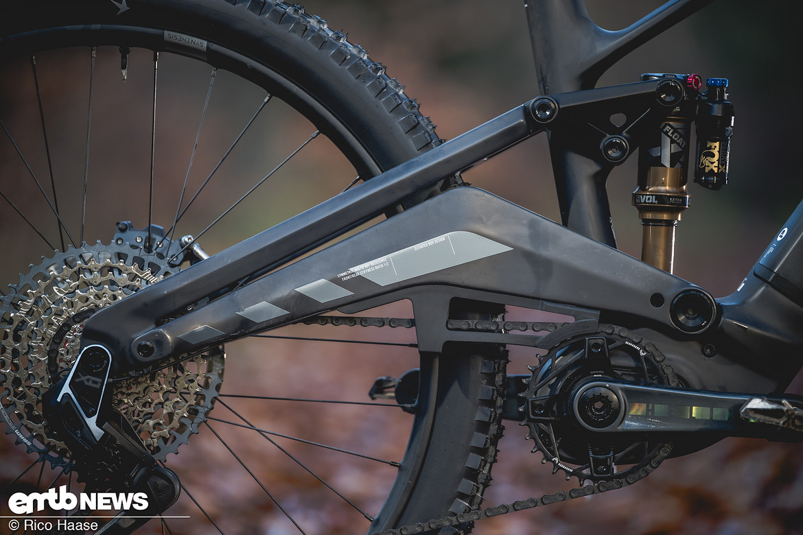 Die stark nach oben gezogene Kettenstrebe und das speziell angepasste Carbon-Layup sorgen für ein leicht flexendes Heck – ohne dabei unpräzise zu werden – sowie viel Reifenfreiheit.